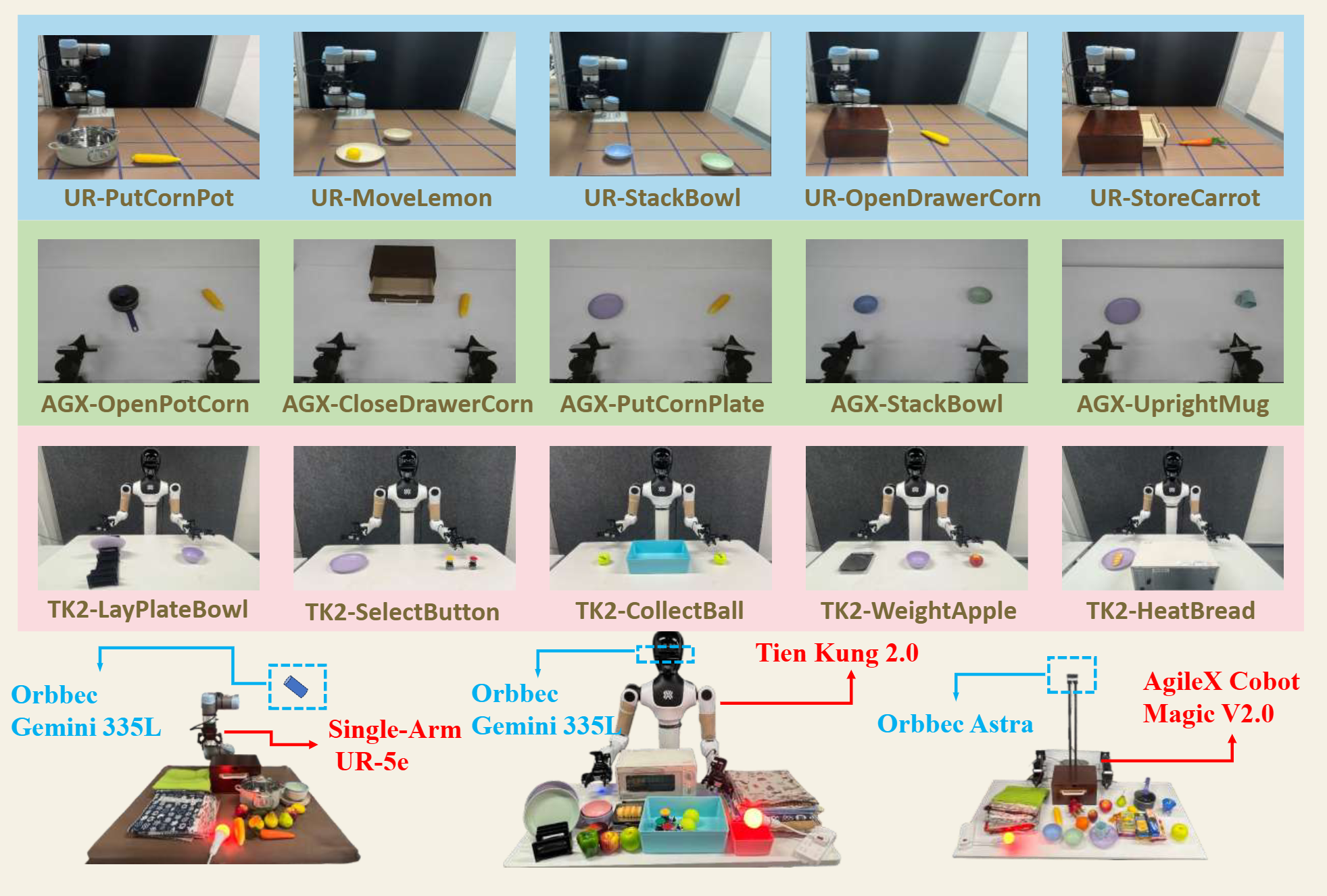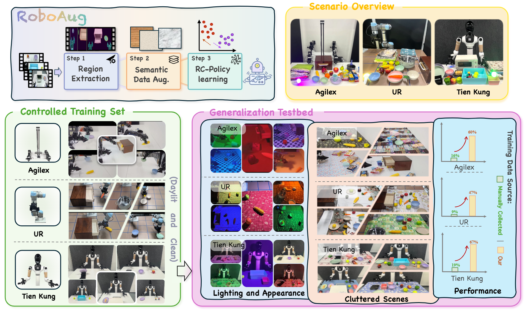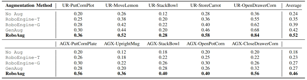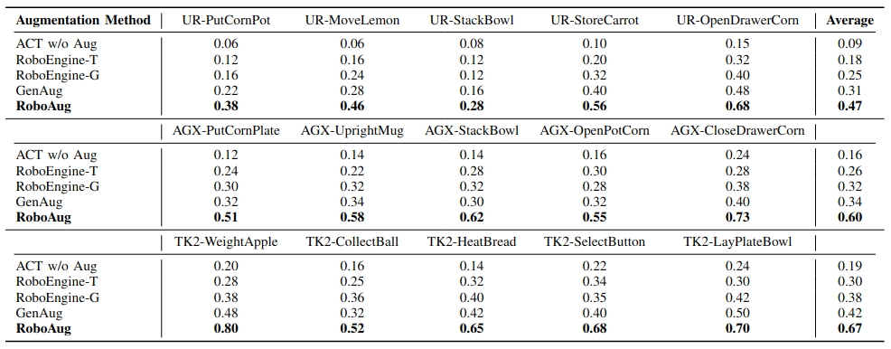 We evaluated RoboAug across three robot embodiments (Tien Kung 2.0, Single-Arm UR-5e, and AgileX Cobot Magic 2.0), spanning tasks from single-arm pick-and-place to precise bimanual manipulation. Through over 35,000 real-world trials, we rigorously assess its generalization to unseen scenes with diverse backgrounds, distractors, and lighting conditions.