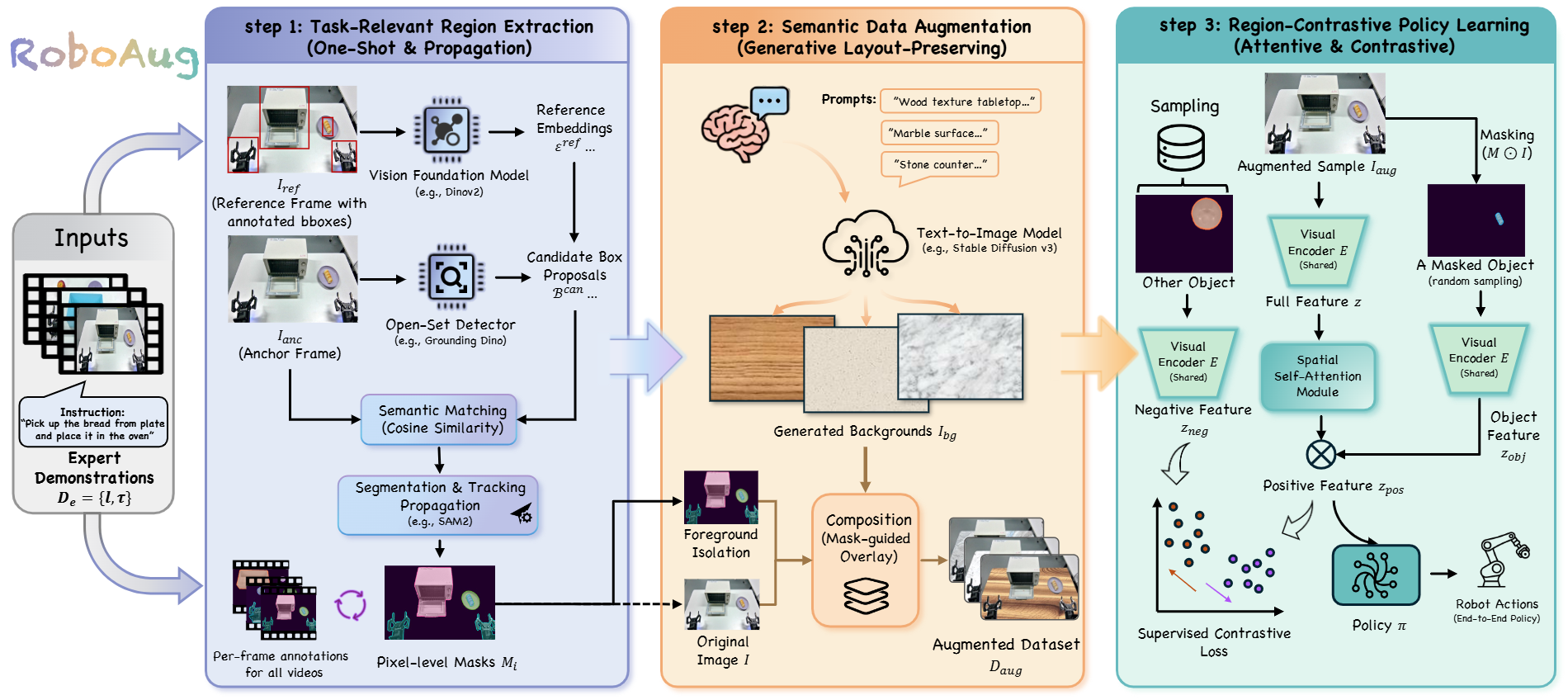 Overview of RoboAug. RoboAug contains three stages: (1) task-relevant region extraction, (2) semantic data augmentation, and (3) region-contrastive policy learning.